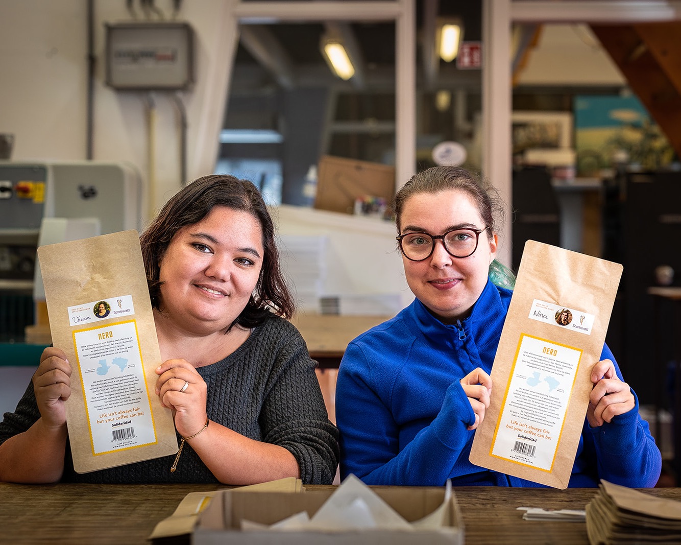 De koffiezakken worden bestickerd en verpakt bij zorginstelling Scorewald