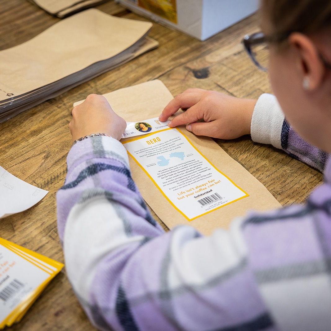 De productie van de koffielabels en bestickering van de koffiezakken wordt verzorgd door Stichting Scorewald, een antroposofische zorginstelling in Schoorl. Scorlewald heeft een ambachtelijke werkplaats waar mensen met een verstandelijke beperking zowel wonen als werken. Zij dragen dan ook vol trots een steentje bij aan onze verpakking.