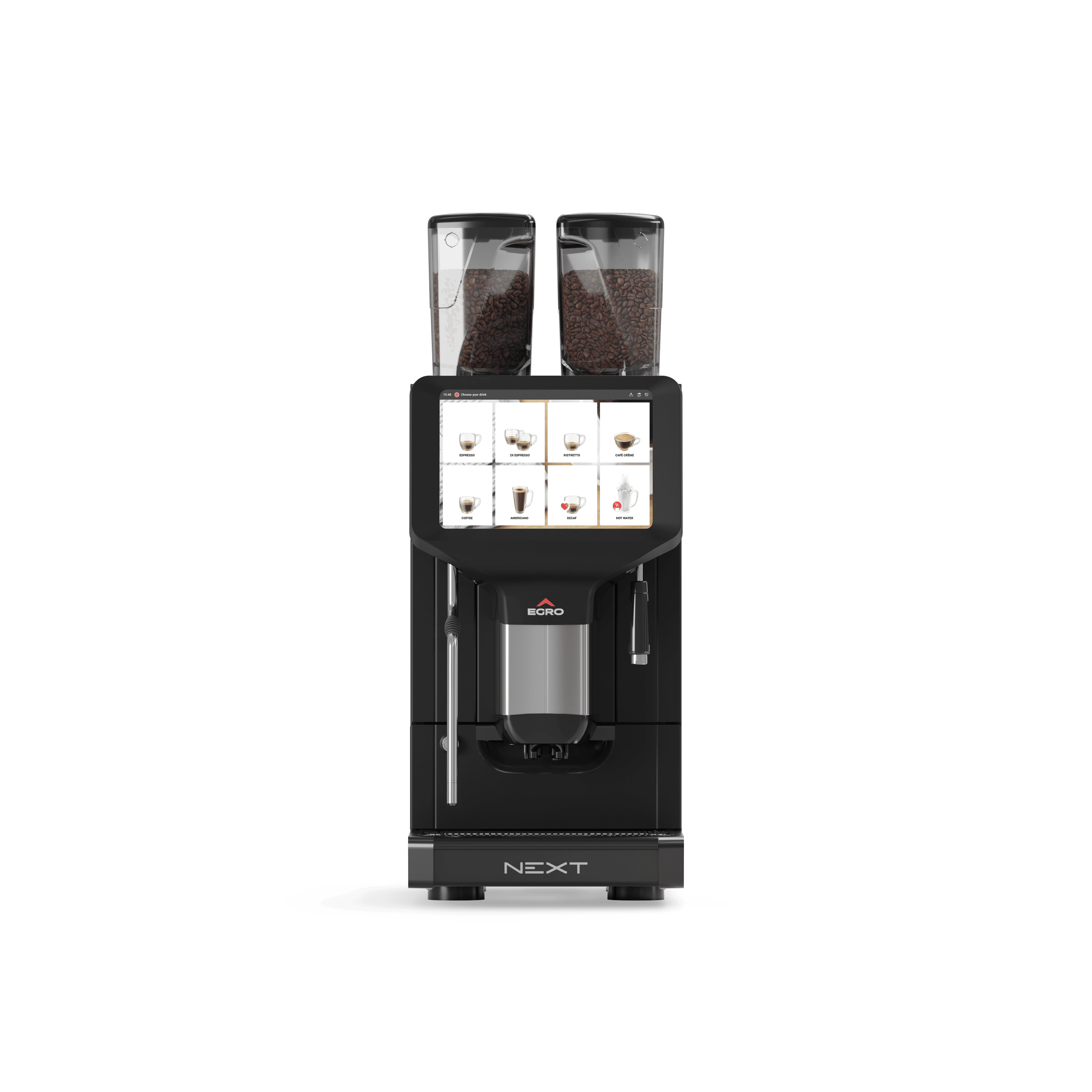 Egro Next is de nieuwe grens in volautomatische koffiemachines. Egro Next heeft een stijlvol, ergonomisch ontwerp en is intuïtief, gebruiksvriendelijk en gemakkelijk schoon te maken. Het garandeert resultaten van topkwaliteit voor alle soorten dranken op basis van koffie, melk en poeder.